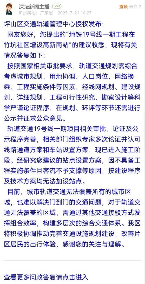 27. 帖文《建议19号线一期设高新南地铁站》