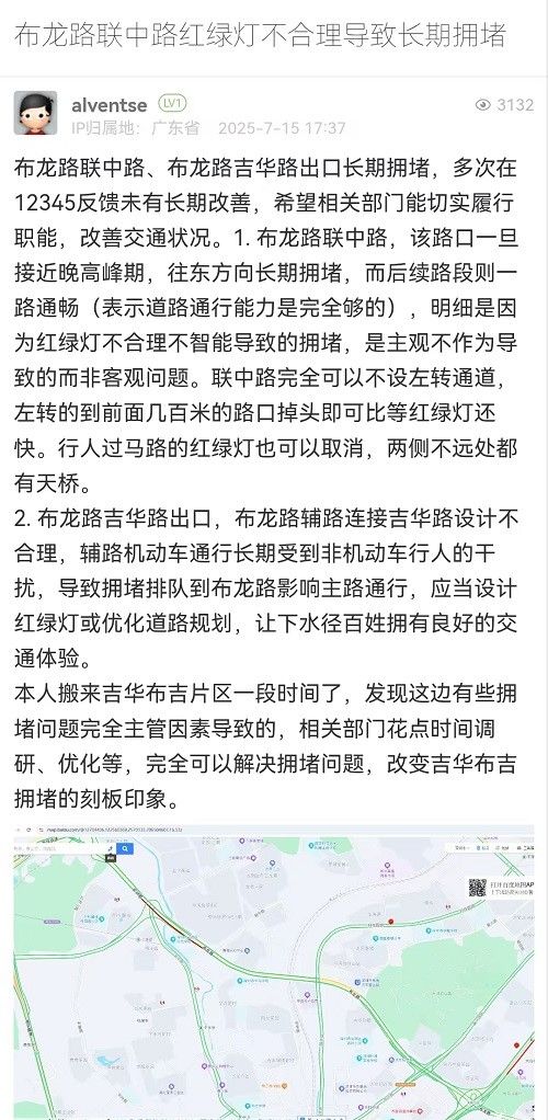 10. 帖文《布龙路联中路红绿灯不合理导致长期拥堵》
