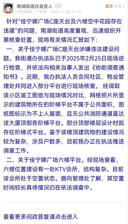 一、关于佳宁娜广场C座天台涉嫌违法建设问题。我街道办执法队已于2025年2月25日现场进行检查,并依法向相关当事人发出《协助调查通知书》。近期,我办执法人员会同社区、物业管理处共同进入部分平台进行现场核查。 经调取该小区竣工图纸与现场情况对比,网络照片所显示的建筑物所在的阶梯平台不属于公共面积,图纸图标示为不上人屋面,且无公共消防通道直达该大厦顶部各阶梯平台。部分顶部楼层设计时就存在阶梯式平台。鉴于该楼顶建筑物的建设情况较为复杂,涉及户数多,目前我办正在执法推进调查工作。