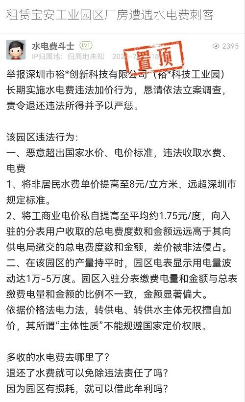 37. 帖文《租赁宝安工业园区厂房遭遇水电费刺客》