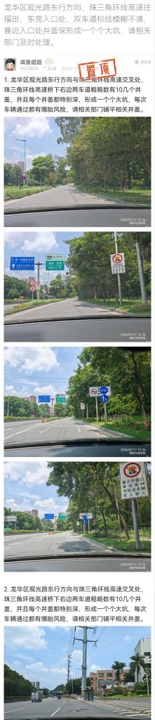 15. 帖文《龙华区观光路东行方向,珠三角环线高速往福田、东莞入口处,双车道标线模糊不清,靠近入口处井盖深形成一个个大坑,请相关部门及时处理。》