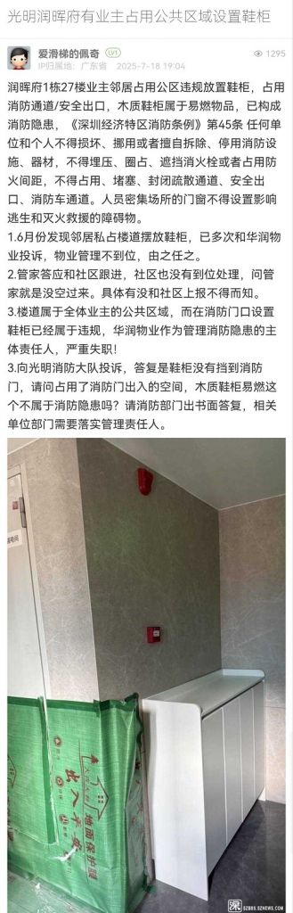 24. 帖文《光明润晖府有业主占用公共区域设置鞋柜》