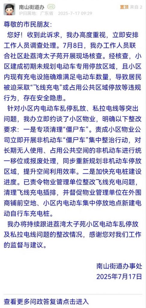 针对小区内电动车乱停乱放、私拉电线等突出问题,我办立即约谈了小区物业,明确以下整改要求:一是专项清理“僵尸车”。责成小区物业公司立即开展非机动车“僵尸车”集中整治行动,对长期无人使用、占用公共空间的非机动车进行统一移位或报废处理,同步重新规划非机动车停放区域,提升空间利用效率。二是加快充电桩建设进度。已责令物业管理单位整改飞线充电问题,清理飞线充电插排,并督促物业管理单位在外围商铺前空地、小区内电动车集中停放地点新建电动自行车充电桩。
