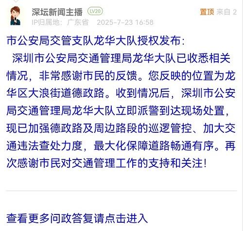 据统计,2025年7月14日-2025年7月20日,网友在深圳论坛发布问政类帖文共39篇,得到相关单位正式回应的帖文数为39篇,本期简报回应速度最快的单位:龙华区水务局、龙华交通局、龙岗区布吉街道办事处、市生态环境局龙岗管理局、市公安局交通管理支队南山大队、龙华区建筑工务署。