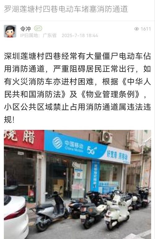 23. 帖文《罗湖莲塘村四巷电动车堵塞消防通道》