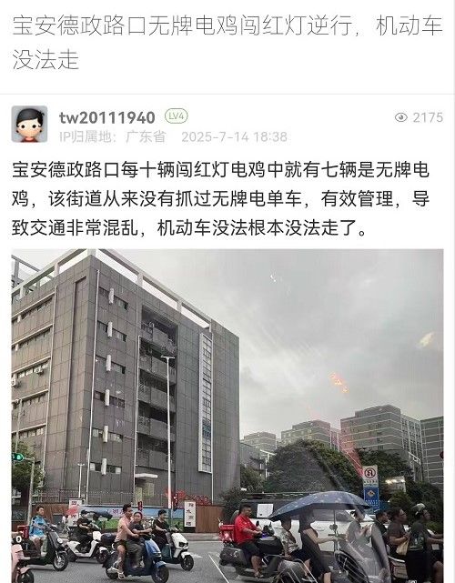 4. 帖文《宝安德政路口无牌电鸡闯红灯逆行,机动车没法走》