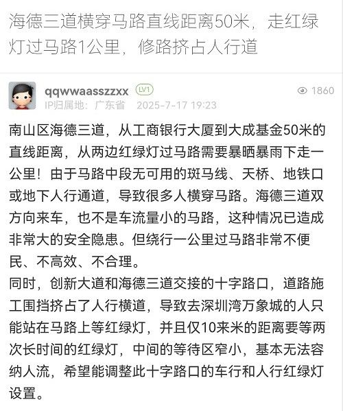 18. 帖文《海德三道横穿马路直线距离50米,走红绿灯过马路1公里,修路挤占人行道》