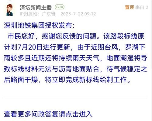 市民您好,感谢您反馈的问题。该路段标线原计划7月20日进行更新,由于近期台风,罗湖下雨较多且近期还将持续雨天天气,地面潮湿将导致标线材料无法与沥青地面贴合,待气候稳定之后路面干燥,将立即完成新标线绘制工作。