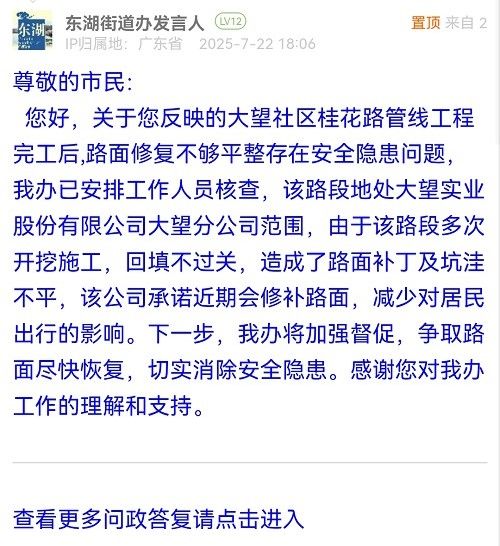 您好,关于您反映的大望社区桂花路管线工程完工后,路面修复不够平整存在安全隐患问题,我办已安排工作人员核查,该路段地处大望实业股份有限公司大望分公司范围,由于该路段多次开挖施工,回填不过关,造成了路面补丁及坑洼不平,该公司承诺近期会修补路面,减少对居民出行的影响。下一步,我办将加强督促,争取路面尽快恢复,切实消除安全隐患。感谢您对我办工作的理解和支持。
