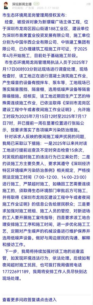 针对诉求人反映的夜间施工噪声扰民的问题,我局已采取以下措施:一是2025年以来共对该工地进行提前巡查及不定时突击检查15余次,对发现的超时施工的违法行为已立案处罚;二是约谈施工方主要负责人,要求其遵守《深圳经济特区环境噪声污染防治条例》相关规定,严格按照法定施工时间(7:00-12:00、14:00-23:00)进行施工,严禁超时施工,如确因工艺需要连续施工的,须取得生态环境部门审批后方可施工,并将取得《深圳市龙岗区建设工程中午或者夜间施工作业证明》的信息公告给居民群众;三是要求加强对施工班组、施工人员的管控,对新进场的工人要开展施工宣传指导;四是要求该工地合理安排施工工序和施工时间,进一步优化施工工艺,定期对产生噪声的机械设备进行维护保养并选用低噪声设备。做好与周边居民的沟通、解释和接访工作。