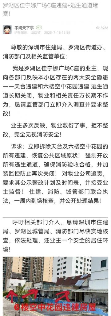 34. 帖文《罗湖区佳宁娜广场C座违建+逃生通道堵塞!》