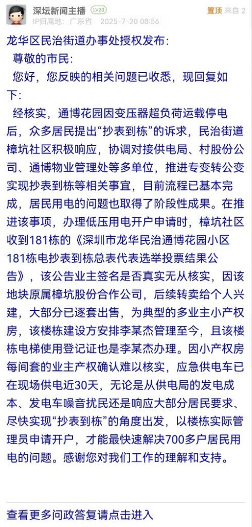 经核实,通博花园因变压器超负荷运载停电后,众多居民提出“抄表到栋”的诉求,民治街道樟坑社区积极响应,协调对接供电局、村股份公司、通博物业管理处等多单位,推进专变转公变实现抄表到栋等相关事宜,目前流程已基本完成,居民用电的问题也取得了阶段性成果。在推进该事项,办理低压用电开户申请时,樟坑社区收到181栋的《深圳市龙华民治通博花园小区181栋电抄表到栋总表代表选举投票结果公告》,该公告业主签名是否真实无从核实,因该地块原属樟坑股份合作公司,后续转卖给个人兴建,大部分已逐套出售,为典型的多业主小产权房,该楼栋建设方安排李某杰管理至今,且该楼栋电梯使用登记证也是李某杰办理。因小产权房每间套的业主产权确认难以核实,应急供电车已在现场供电近30天,无论是从供电局的发电成本、发电车噪音扰民还是响应大部分居民要求、尽快实现“抄表到栋”的角度出发,以楼栋实际管理员申请开户,才能最快速解决700多户居民用电的问题。感谢您对我们工作的理解和支持。