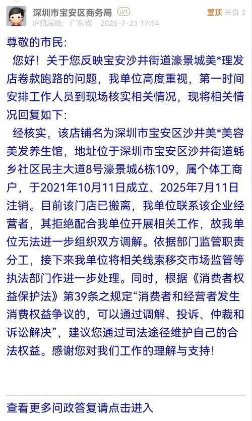 您好!关于您反映宝安沙井街道濠景城美*理发店卷款跑路的问题,我单位高度重视,第一时间安排工作人员到现场核实相关情况,现将相关情况回复如下: