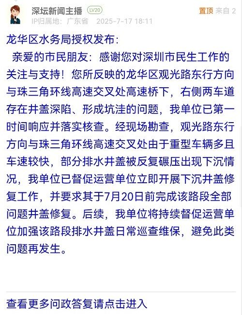 亲爱的市民朋友:感谢您对深圳市民生工作的关注与支持!您所反映的龙华区观光路东行方向与珠三角环线高速交叉处高速桥下,右侧两车道存在井盖深陷、形成坑洼的问题,我单位已第一时间响应并落实核查。经现场勘查,观光路东行方向与珠三角环线高速交叉处由于重型车辆多且车速较快,部分排水井盖被反复碾压出现下沉情况,我单位已督促运营单位立即开展下沉井盖修复工作,并要求其于7月20日前完成该路段全部问题井盖修复。后续,我单位将持续督促运营单位加强该路段排水井盖日常巡查维保,避免此类问题再发生。