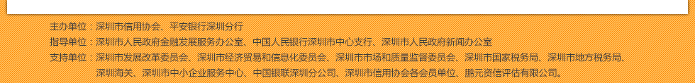 支持单位:深圳市发展改革委员会、深圳市经济贸易和信息化委员会、深圳市市场和质量监督委员会、深圳市国家税务局、深圳市地方税务局、深圳海关、深圳市中小企业服务中心、中国银联深圳分公司、深圳市信用协会各会员单位、鹏元资信评估有限公司。