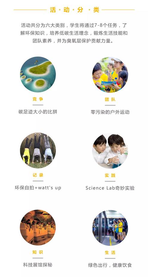 1.在一天时间内挑战“臭氧英雄·低碳足迹”国际主题活动,学习低碳生活技能,感受中英双语课堂;