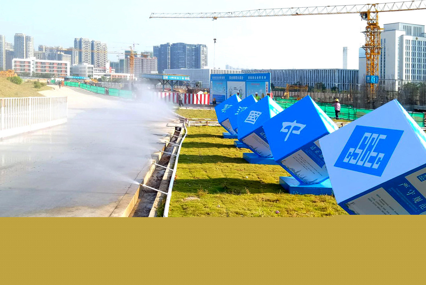 日前,在观澜街道地铁四号线4302标段施工工地上空,四套高耸的塔吊喷雾系统格外引人注目。