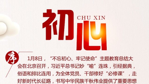 2020年1月8日,习近平总书记在“不忘初心、牢记使命”主题教育总结大会上的讲话中指出,要以党的创新理论滋养初心、引领使命,从党的非凡历史中找寻初心、激励使命,在严肃党内政治生活中锤炼初心、体悟使命,把初心和使命变成锐意进取、开拓创新的精气神和埋头苦干、真抓实干的原动力。
