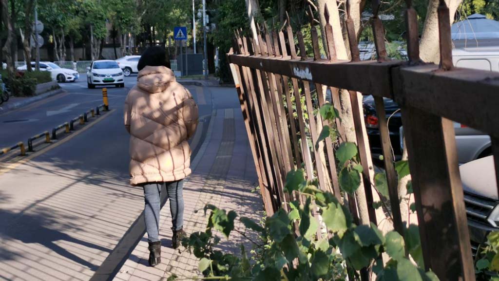 由于竹香一路一侧人行道通行距离不足一米,且靠近深南汽配城的铁栅栏”张牙舞爪“,摇摇欲坠,向外倾斜挤压了通行空间,不少家长让孩子走在人行道上,自己则是走在车行道上,与身边的汽车擦肩而过。